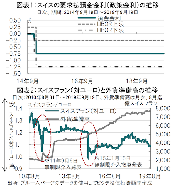 スイス国立銀行(中央銀行、SNB)は2019年9月19日、市場予想通りに政策金利である要求払預金金利をマイナス0.75%で据え置きました(図表1参照)。