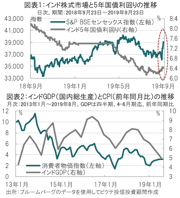 インドのシタラマン財務相が公表した法人税減税は実効税率を約35%から約25%へ引き下げるうえ、新規企業への優遇税制やキャピタルゲイン減税など幅広い対応が見られました。インド経済に成長鈍化が見られる中、景気てこ入れを狙ったもので、株式市場は上昇しました。ただ、財政負担の増大も懸念され国債市場で利回りが上昇するなど、冷静な分析も必要と思われます。