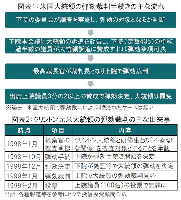 次に、弾劾手続きに必要な期間を見ると、クリントン元大統領の場合、調査開始からで1年程度、弾劾手続きからでも数ヶ月費やしています(図表2参照)。もっとも、調査期間の長さなどにより弾劾裁判全体に必要とる期間は左右されると思われますが、ある程度の長期戦が見込まれます。