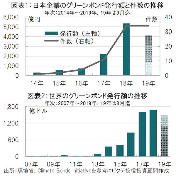 日本国内企業が18年に発行したグリーンボンドの発行額は5000億円を上回り、17年に比べ大幅に伸びています。19年も現時点で4000億円程度と、18年を若干上回るペースとなっています(図表1参照)。