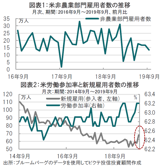 米労働省が2019年10月4日に発表した9月の雇用統計で、景気動向を反映すると言われる非農業部門雇用者数(事業所調査、季節調整済み)は13.6万人増と、市場予想(14.5万人増)を下回りました。8月は16.8万人と、速報値の13万人から上方修正され、7月の7000人と合わせ、2ヵ月で合計4.5万人上方修正されました(図表1参照)。