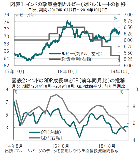 その理由として、足元のインフレ率は約3.2%ながら、来週公表予定の9月の消費者物価指数(CPI)は前年同月比3.7%程度が見込まれるなど、食料品などに、緩やかながら上昇傾向が見られます。また、インド政府による法人税の引き下げなど他の景気てこ入れ策も発動されており、政策効果を見守る必要性もあるように思われます。