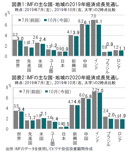 四半期毎改定されるWEOにおいて、IMFは19年の成長率予想を5四半期連続で下方修正し、19年の世界経済成長率を好不況の目安とされる3.0%へ下方修正しました。また、政策の余地は限られ、今後ミスは許されないと警告しています。ただ、来年の成長率は今年を上回るとの見方を維持しており、(反対に)政策が適正であれば底打ちとの深読みができるのかもしれません。