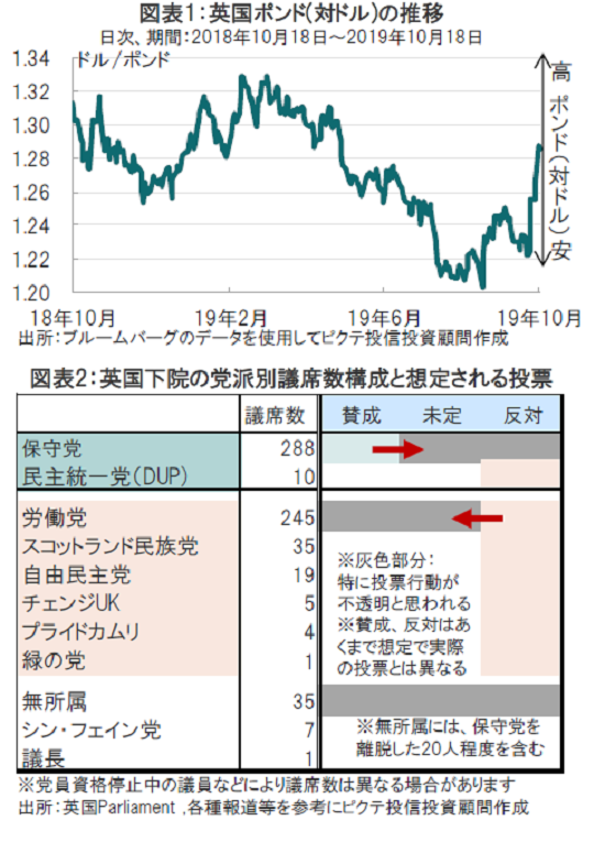 英国と欧州連合(EU)は2019年10月17日、英国とEUの新たな離脱協定/政治宣言に合意しました。16年の国民投票から3年以上混乱が続く英国のEU離脱に道筋を整える可能性があります。市場では離脱協定合意に向けた動きを受け、ポンド高が進行していました(図表1参照)。