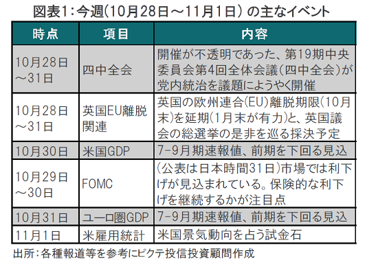 今週は重要イベントが目白押しです。経済では欧米でGDP(国内総生産)などが公表されます。また、FOMCでは今後の金融政策の方針が注目されます。政治では、10月末の離脱期限を前に、英国の合意なき離脱のリスクは低下しましたが、今後の動向を占う上で今週の動きに注目しています。中国の四中全会は地味な印象ですが開催されたことに意味があると思われます。