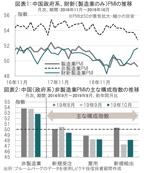 中国国家統計局と中国物流購入連合会が2019年10月31日に発表した10月の(政府系)製造業購買担当者景気指数(PMI)は49.3と、市場予想(49.8)、前月(49.8)を下回りました。10月の非製造業PMIは52.8と、市場予想(53.6)、前月(53.7)を下回りました(図表1参照)。