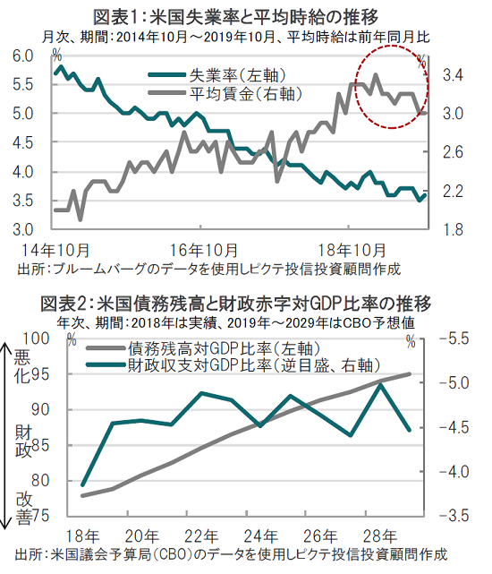 まず、議会証言の中でハト派的と思われるのは、パウエル議長の雇用市場に対する認識です。議会証言では、複数の議員から「失業率が低下しているのに、何故給料が上がらないのか?」というニュアンスの質問が飛びました(図表1参照)。パウエル議長はポツリと「ピークの(前年同月比)3.4%が3.0%になっただけ」(恐らく本音)とも述べていますが、説明の中で、米国の失業率がさらに低下する可能性に言及しています。米国雇用市場に、今後も余裕(スラック)があると見ているのは、ハト派的な見解と思われます。