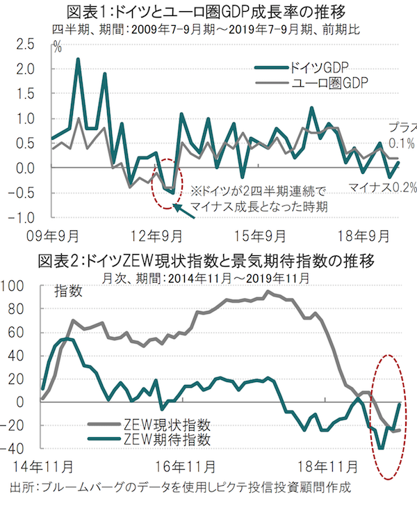 ただ、先のZEW指数のうち足元の動きを反映するZEW現状指数を見ると水準は低く、厳しい景気の現状が示唆されています。期待指数の回復も、現状よりはましという程度の水準と思われます。ピクテではドイツの20年成長率を年率で0.7%と見込んでおり、19年の予想成長率0.6%とあまり変わらない、きわめて緩やかな回復しか見込んでいません。ドイツは来年財政を拡大する予定ですが、現状は最大許容範囲内での拡大にとどめる模様です。今後の展開しだいでは、踏み込んだ対応を求められる可能性も考えられます。