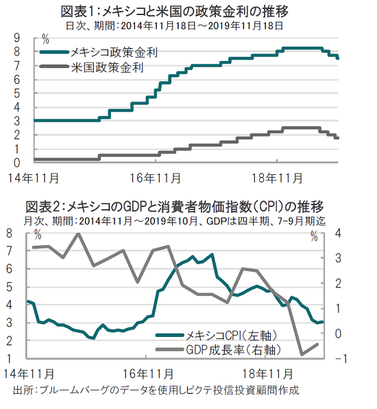 メキシコ銀行(中央銀行)は2019年11月14日の金融政策決定会合で、市場予想通り政策金利を7.75%から0.25%引き下げ7.50%としました。メキシコ中銀は今年8月におよそ5年ぶりに利下げを実施して以降、3会合連続で政策金利を引き下げています(図表1参照)。