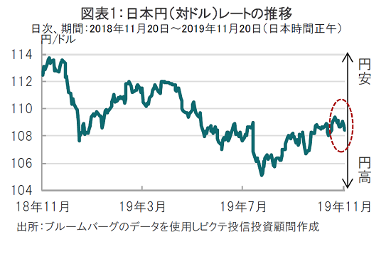 香港での警察と抗議デモ参加者との激しい衝突が報道されています。デモの先行きが不透明な中、米国上院でデモ隊を支持する内容である香港人権法案が可決しました。米中貿易交渉が合意を目指す中での米議会の動きに中国政府は不満を示しています。市場では小幅ながら、リスク回避姿勢を反映して円高ドル安が進行しました(図表1参照)。