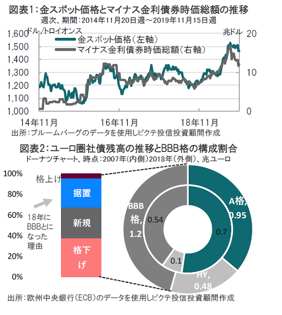 1点目は、試算市場において、今までとは違うリスクテイクのパターンが見られることです。例えば、マイナス金利で取引される債券の時価総額は急増していましたが、それに伴う格好で金価格は上昇していました(図表1参照)。金利低下がマイナスにまで進行する過程で、安全資産への需要が高まった側面が見られます。