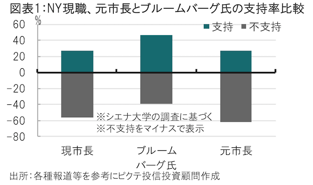 その上、NY市長を3期務めています。市長としての評価は現職、元市長(ブルームバーグ氏の前任)を上回るという調査もあるなど人気を保っています(図表1参照)。