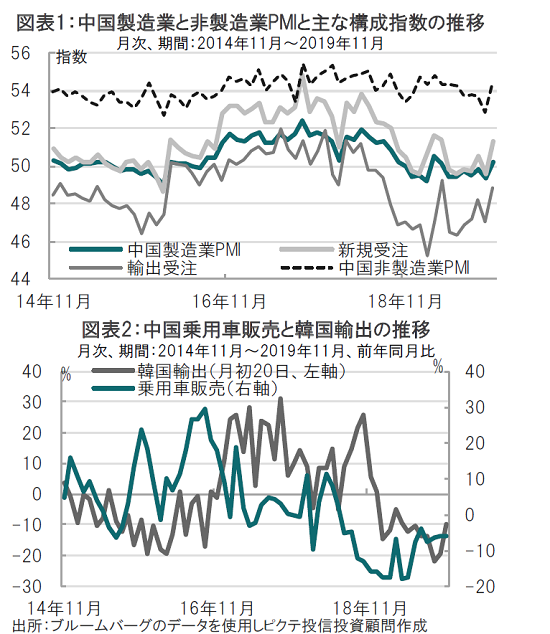 次に、世界的な輸出底打ち期待から、新規受注などが回復したこともプラス要因です。中国統計局が新規受注の回復はクリスマス商戦の海外受注の増加と指摘するように、PMIでも輸出受注などが回復しています。米中貿易戦争は、第1段階とはいえ、近いうちに合意に向かうとの楽観的な見方が優勢なことも下支え要因と見られます。貿易の底打ちは中国以外の指標にも見られます。特に世界貿易の先行指標として重視される韓国の輸出を見ても足元で底打ちが見られます(図表2参照)。米国などの景気後退まで織り込む悲観的な見方の修正を反映した可能性があります。