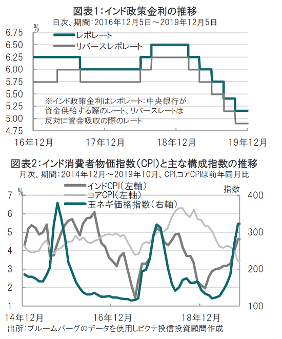 インド準備銀行(中央銀行)は2019年12月5日の金融政策決定会合で市場予想に反し、政策金利(レポレート)を5.15%で据え置くことを決定しました(図表1参照)。市場では大半が6会合連続となる利下げを予測していました。