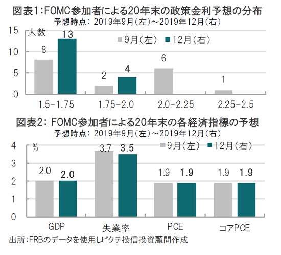まず、FOMC内の意見集約が進んだ点です。前回までのFOMCでは金融政策の投票で2名の反対者(利上げを支持)がいましたが、今回は全会一致で据え置きの決定が支持されています。また、20年末の政策金利の水準予想について、9月時点の予想では据え置きと利上げに分かれていました(図表1参照)。しかし今回は13名と大半が据え置きを支持しています。予想については、全員が一致する必要も、するべきものでもありませんが、意見が割れたままでは市場も判断に迷うところです。