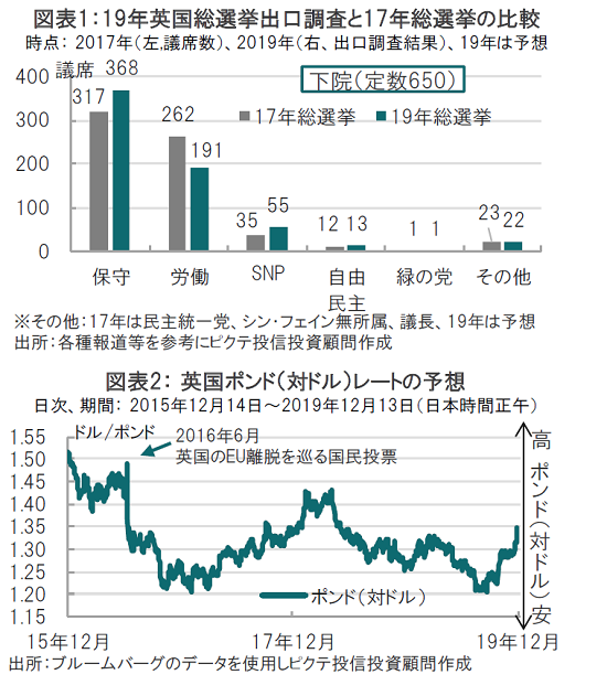 現地メディアの出口調査によると、保守党は368議席、労働党は191議席、自由民主党13議席、スコットランド民族党(SNP)55議席、緑の党(1議席)と予想されています(図表1参照)。なお、ブレグジット党はゼロが予想されています。保守党の出口予想は、直前の世論調査(339議席程度)を大幅に上回る結果が見込まれています。