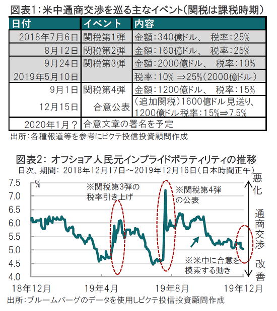 米中両国政府は2019年12月13日、米中貿易交渉で「第1段階の合意」に達したと発表しました。米国が15日に予定していた中国製のスマートフォンなどを対象とした15%の関税1600億ドル分の発動(「第4弾」の残り上乗せ分)を見送るとしています(図表1参照)。