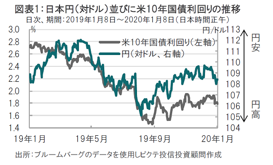 まず、日本時間8日午前の市場では、円高が一時107円台まで進行、日経平均も一時前日比600円を超える下げとなりました。海外のショックを日本市場が最初に受ける不運(?)に見舞われた格好です。また、日本時間に取引された米10年国債利回りも一時1.70%近辺まで低下(価格は上昇)しています(図表1参照)。全般的にイランに関連する地政学リスクへの楽観論に水を差された形です。