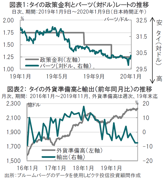 タイ銀行(中央銀行)のウィラタイ総裁は2020年1月8日のインタビューで、バーツ高の抑制に向け(図表1参照)、今後数カ月間で資本流出規制をさらに緩和していく方針を示唆しました。これを受け、バーツは下落しました。