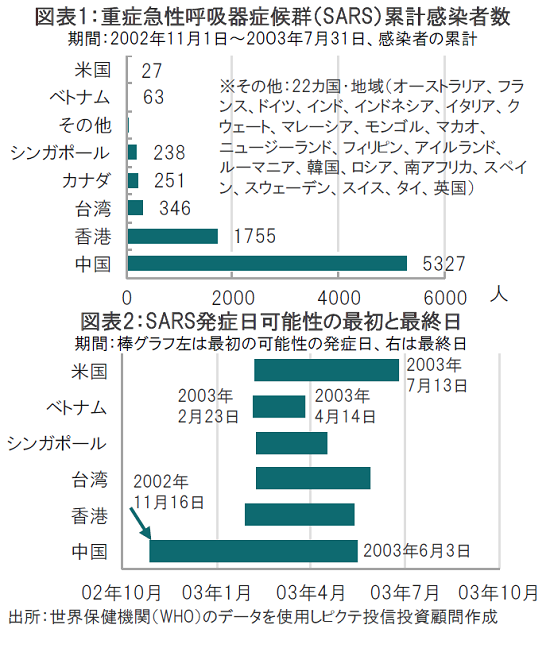 中国武漢市で発生した新型肺炎は、人から人への感染が確認されたこと、米国でも感染が確認されたことで感染者の拡大が懸念されています。2002年に中国で発生したコロナウイルスの一種であるSARS(重症急性呼吸器症候群)が世界約30ヵ国で拡大しました(図表1参照)。単純に同じパターンを繰り返すわけではないにしろ、感染者数が多かったSARSを振り返ります。