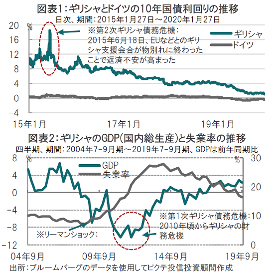 財政緊縮だけでなく、ギリシャの成長戦略により経済成長率も、失業率の低下と共に、2%前後での推移となっています(図表2参照)。リーマンショックよりも影響が大きかった成長率の下落を克服しつつあります。昨年発足した中道右派のミツォタキス政権は法人税の引き下げで投資を呼び込み、左派政権で停滞していた民営化も、前向きに進めています。