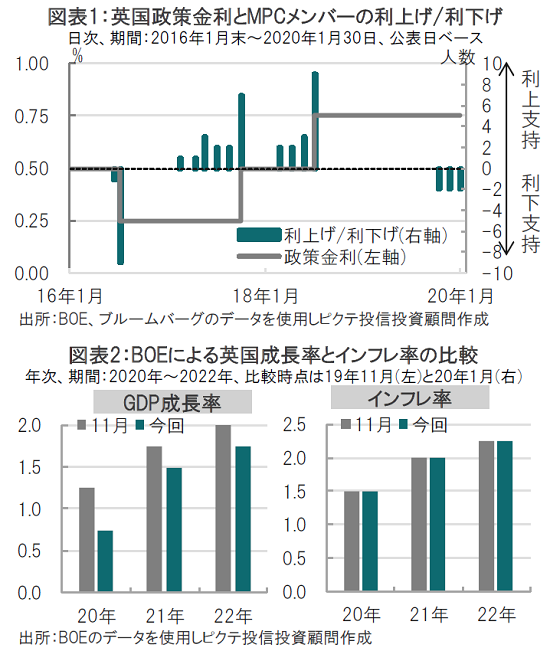 例えば、BOEの経済予想を見ても、GDP(国内総生産)成長率は前回(19年11月)に比べ下方修正されています(図表2参照)。また、議事要旨には、国内外の景気回復が持続しない場合やインフレ率の回復が鈍い場合などは、刺激策として利下げの可能性を示唆しています。