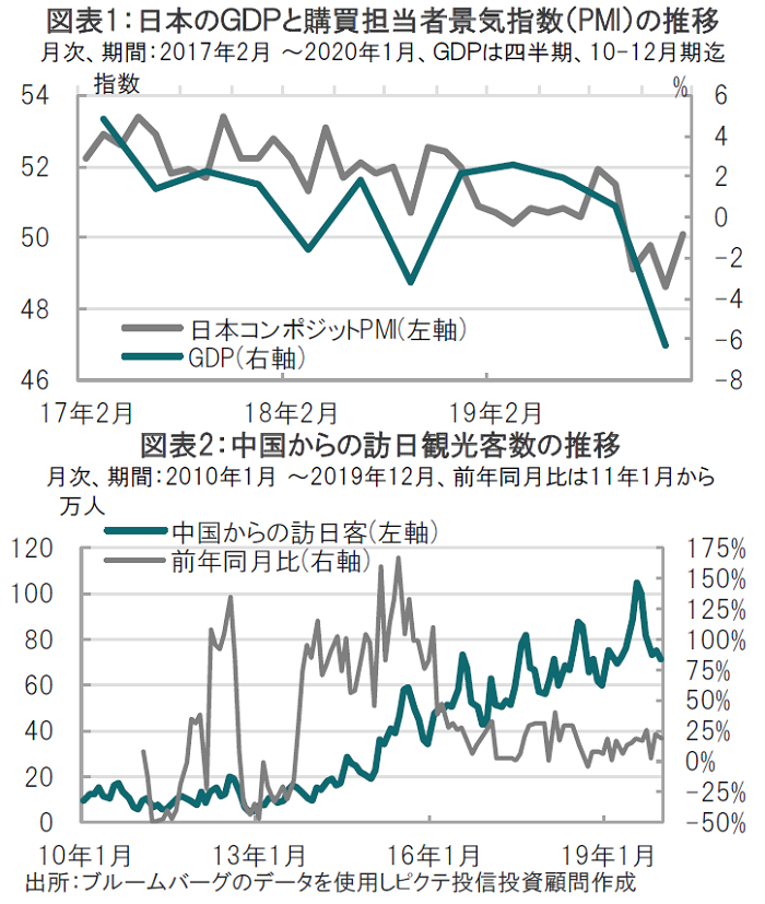 GDPは過去の統計と割り切れれば良いのですが、1-3月期のGDP成長率に新型コロナウイルスの影響が気になります。消費税などの影響による成長率下落だけであれば、短期的な回復も期待されます。GDPに先行する傾向がある総合購買担当者景気指数(PMI)の20年1月は50.1と回復の兆しも見られます(図表1参照)。