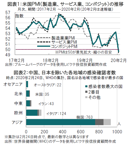 まず、経済指標では21日に公表された米国の2月の製造業やサービス業購買担当者景気指数(PMI)が市場予想を下回り、新型コロナウイルスの影響が経済指標に現れた点が注目されます(図表1参照)。PMIは調査ベースの指標という性格上、鉱工業生産指数などに比べ速報性が高く、他の調査ベースの指標(例えば地区連銀公表データ)などに比べサンプルサイズが大きいことなどから注目度の高い指標です。また、米国GDPの大半を占めるサービス業を幅広くカバーしています。2月の米国PMIは恐らく旅行業などの悪化を受けサービス業PMIが49.6と景気拡大・縮小の目安となる50を下回りました。これが一時的なマインドの落ち込みなのか、それとも本格的悪化なのか今後も注視が必要です。