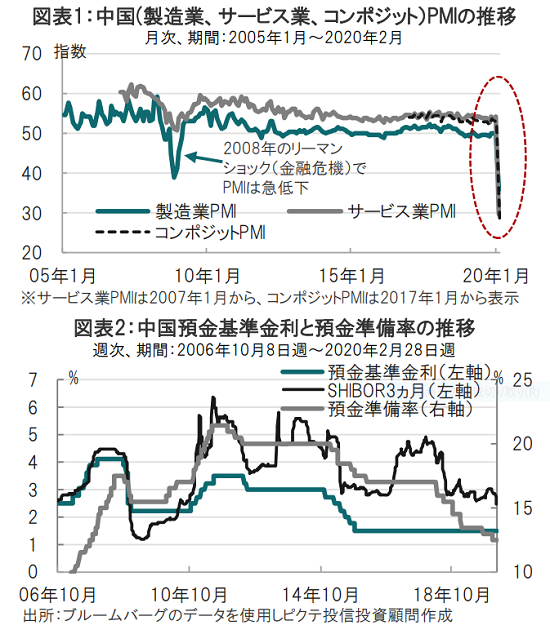中国国家統計局が2020年2月29日発表した2月の(政府系)製造業購買担当者景気指数(PMI)は35.7と、市場予想(45.0)、前月(50.0)を大幅に下回りました(図表1参照)。