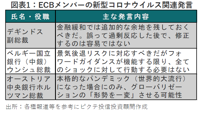 なお、経済対策には国際通貨基金(IMF)が融資を示唆したり、各国で財政政策なども検討されています。この動きの中で、金融政策は重要ですが、今回は主役とは言い難いようです。例えば、先の主要中央銀行の声明でも、ECBを例にとると、金融緩和の必要性を述べながらも、声明文の終わりの方で「適切に的を絞った対応策」と説明しています。また、ごく最近のECBメンバーの発言においても、慎重さがうかがえます(図表1参照)。今回のような感染症の拡大や自然災害などでは資金繰り悪化先への(的を絞った)融資のような一見地味な対応の重要性が高いことが考えられます。幸い、当局の中で資金繰り対応への重要さが議論されており、適切な対応を期待したいところです。