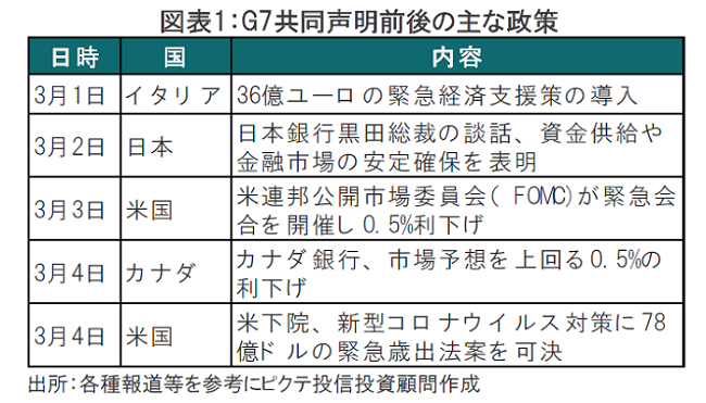 3月4日の米国株式市場は急反発しました。米大統領選に向けた民主党候補指名争いで、バイデン前副大統領が健闘し、左派の「サンダース大統領」のリスク低下が株価反発の要因と見られます。また先進7ヵ国(G7)の財務相・中央銀行総裁の共同声明を受けた政策への期待も市場を下支えした要因と見られます。共同声明を受けた政策は次の点が主な特色と見ています。