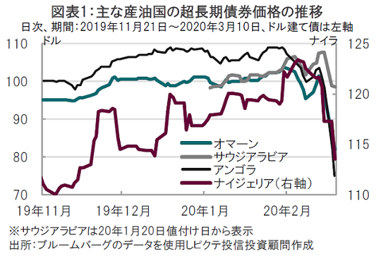 今日のヘッドライン2020年3月9日号で述べた原油価格の急落などを背景に、産油国の信用リスク悪化が懸念されています。主な産油国の債券価格は足元急落しています(図表1参照)。価格競争による原油価格下落、原油需要鈍化予想、産油国の財政状況悪化と通貨安などを受け、産油国のクレジットには注視が必要と見ています。
