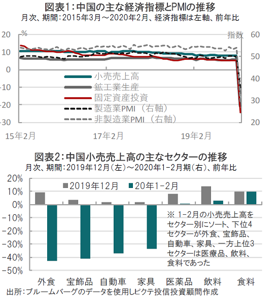 中国国家統計局が2020年3月16日に発表した1-2月の鉱工業生産は前年比(1-2月)マイナス13.5%と、市場予想(マイナス3%)を下回りました。1-2月の小売売上高は前年比マイナス20.5%と、市場予想(マイナス4.0%)を下回りました。都市部固定資産投資は前年比マイナス24.5%と、市場予想(マイナス2%)を下回りました(図表1参照)。