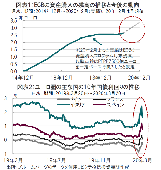 欧州中央銀行(ECB)は2020年3月18日(日本時間では19日朝方)、新型コロナウイルスの感染拡大に対応し、7500億ユーロ(約89兆円)相当の新たな臨時の資産購入プログラム(パンデミック緊急購入プログラム、PEPP)を導入すると発表しました(図表1参照)。