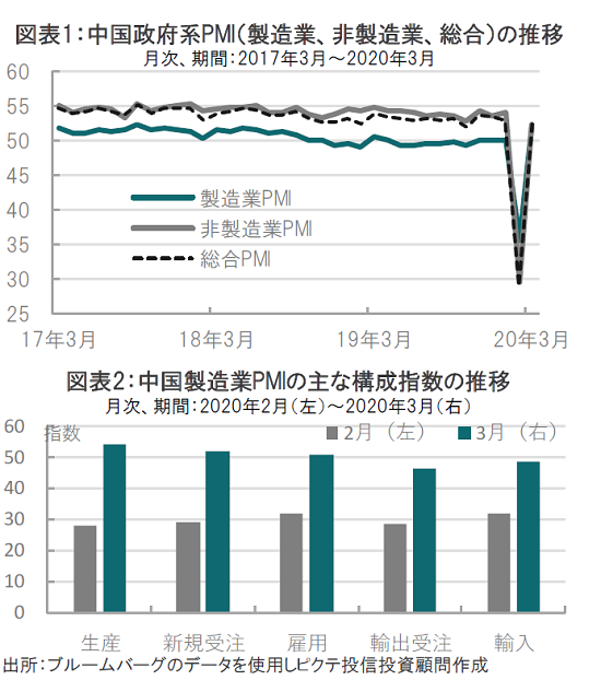 中国国家統計局が2020年3月31日に発表した3月の製造業購買担当者景気指数( PMI ) は52.0 と、市場予想(44.8)、過去最低だった2月の35.7を大幅に上回りました。3月の非製造業PMI も52.3 と、市場予想( 42.0 ) 、前月(29.6)を大幅に上回りました(図表1参照)。