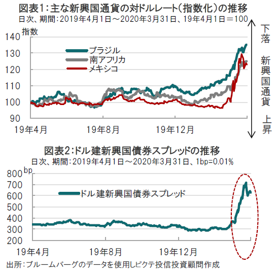 米国の文章では一般に、最初に結論が述べられることが多いとよく言われますが、FIMAレポファシリティの声明では最後の段落が意味する、FRBが国際通貨ドルの役割を認識し流動性を供給するのが本音と見られます。特に恩恵を受けると思われる新興国は新型コロナウイルスの感染拡大に伴い通貨安(図表1参照)に見舞われており、対策は急務です。