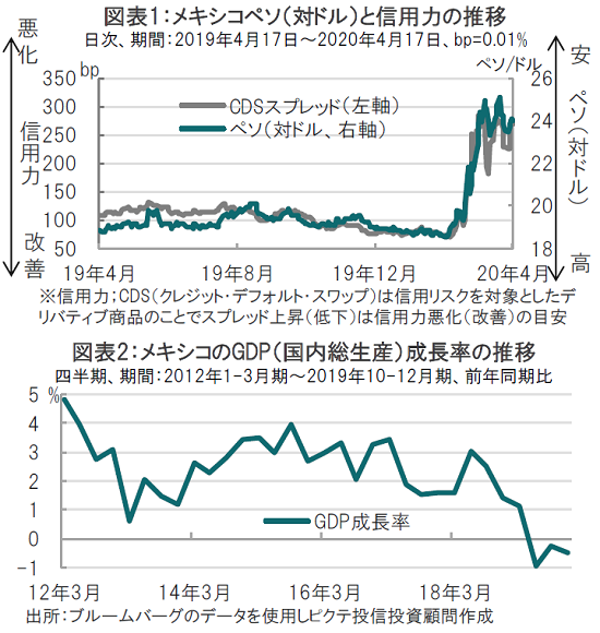 メキシコはこの1ヵ月ほどの間に主な格付け会社3社から格下げされました。新型コロナウイルスと原油価格の下落で新興国の格下げが続いていますが、3社からの格下げとなると、他の国ではアルゼンチンやエクアドルなどしか思いつきません。このような背景を受け、メキシコの通貨ペソは下落傾向で信用力も悪化しています(図表1参照)。格下げの要因として次の点が指摘されています。
