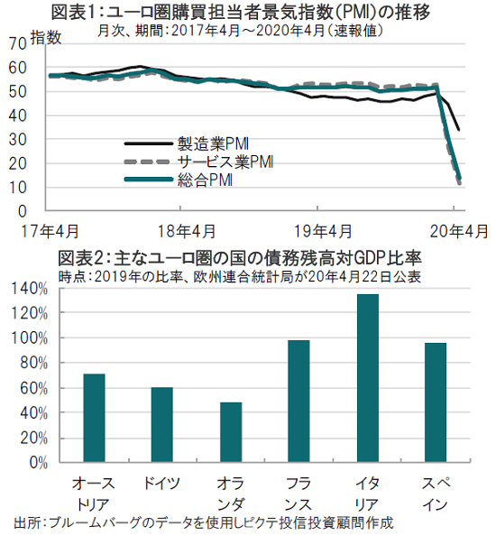 今回のEU首脳会談では、復興基金の設置に大枠で合意となりました。同じ23日に公表されたユーロ圏の4月の購買担当者景気指数(PMI)が前月に続き歴史的低水準であったことを見ても、大規模な景気支援策が求められることは容易に想像できます(図表1参照)。ただ、詳細が先送りされた要因は財源と見られ、ユーロ圏の財政問題が浮き彫りとなった面も見られます。