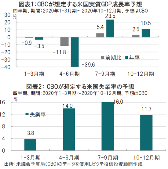 米国議会予算法に基づき設置され、中立的な立場で予算や前提となる経済指標の推計を行う米国議会予算局(CBO)が、最新の見通しを公表しました。GDP成長率や失業率は歴史的な水準への悪化が見込まれています。ただ、市場の反応は冷静にも見えます。その背景を述べつつ、CBO予想のポイントについて振り返ります。