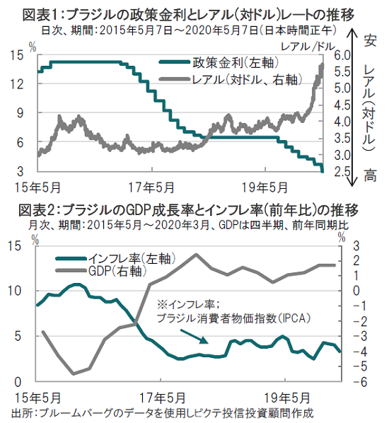 ブラジル中央銀行は2020年5月6日、政策金利を0.75%ポイント引き下げて過去最低の3.00%としました(図表1参照)。利下げは7会合連続市場で、市場では大半が0.5%ポイントの利下げを予想していました。新型コロナウイルスの感染拡大でインフレ圧力が抑制された中で大幅利下げとなりました。