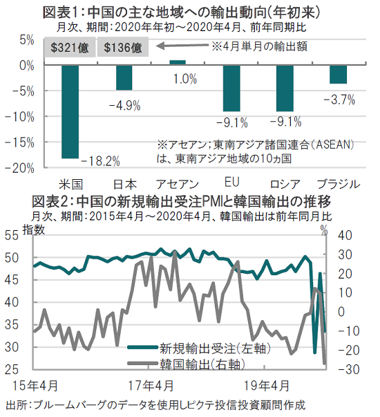 中国の輸出先を年初来で見ると、東南アジア向けの輸出が比較的堅調な一方で(図表1参照)、日欧米並びに主要新興国向けの輸出は、新型コロナウイルス感染拡大で需要が軟調となっています。