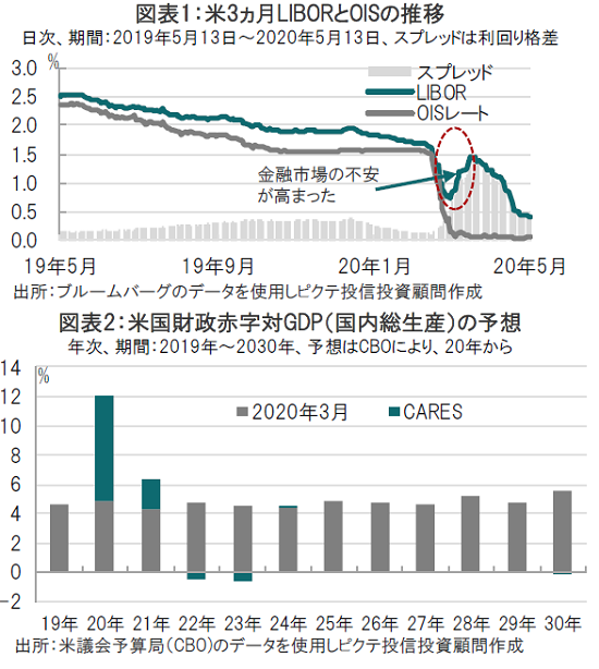2つ目は金融政策です。パウエル議長はこれまでの4つの政策が市場機能を回復させたとして(図表1参照)、当面はこれらの政策の重用を示唆しました。なおこれらの政策は①国債等の購入、②ドルスワップなどによる流動性供給、③財政のバックファイナンスによる家計や企業などへの直接的な資金供与、④銀行への規制緩和により企業などへの貸出余力提供、となっています。一方で、トランプ大統領から求められているマイナス金利については、議論はしたものの現時点の選択肢ではないと述べています。パウエル議長の理由は明確ではありませんが、流動性不安が完全に解消されていない現段階では、レポやコマーシャルペーパーの受け皿となっているMMF(マネーマーケットファンド)への影響を回避したいためであると思われます。ただ、将来的に政治からの圧力はくすぶるかもしれません。