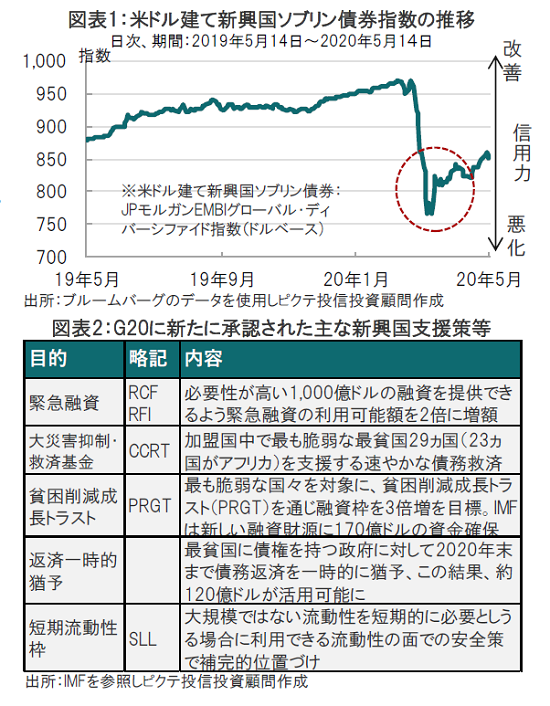 新型コロナウイルスの感染拡大または原油価格の急落を背景に新興国の信用力が悪化しました(図表1参照)。しかし各国、特に米国の市場機能回復に向けた政策対応や、国際通貨基金(IMF)などの支援期待から足元、落ち着きは見られますが、今後の展開には懸念材料も残されています。