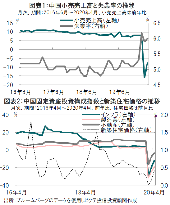 中国国家統計局が2020年5月15日に発表した4月の工業生産は前年同月比+3.9%と、市場予想(+1.5%)、3月(マイナス1.1%)を上回りました。4月の小売売上高は前年比マイナス7.5%と、市場予想(マイナス6%)を下回りました(図表1参照)。また、1-4月の都市部固定資産投資は前年同期比マイナス10.3%と、市場予想(マイナス10.0%)と概ね一致し、1-3月のマイナス16.1%からはマイナス幅が縮小しました(図表2参照)。