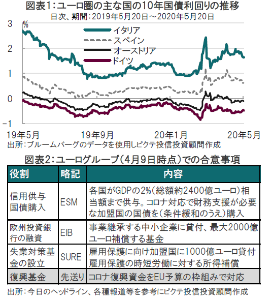 今日のヘッドライン20年4月10日号でユーロ圏財務相会合(ユーログループ)の合意内容をお伝えしました(図表2参照)。それから1ヵ月以上経過し、先送りされた復興基金が、規模や財源について独仏間で合意されました。財源をEU共同としたためイタリアなどは提案に賛成する一方、北欧は早速反対姿勢ですが、欧州的ペースでは前進と思われます。