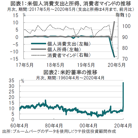 新型コロナウイルスの感染拡大抑制に向けた封鎖政策の影響を反映して4月の消費は自動車などを含む資本財と、娯楽や外食などサービスセクターが大幅なマイナスとなりました。一方、個人所得は市場予想では減少が見込まれていましたが、景気下支え政策(CARES法)により大幅なプラスを確保しました。