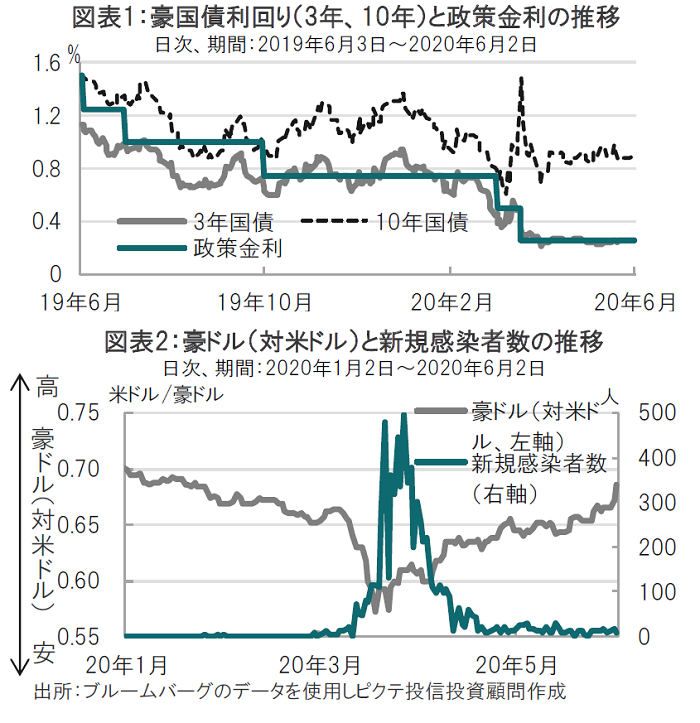 オーストラリア(豪)準備銀行(RBA、中央銀行)は2020年6月2日の金融政策理事会で政策金利と3年国債利回りを市場予想通り0.25%で据え置きました(図表1参照)。