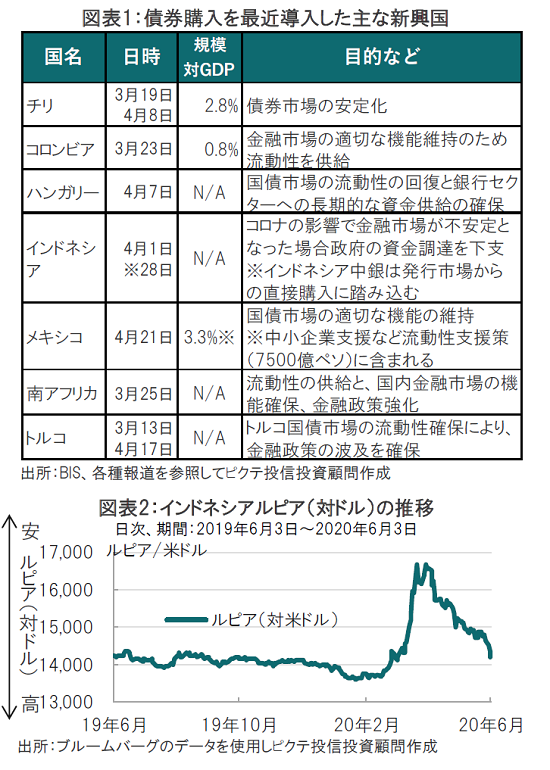 新興国の中央銀行による量的金融緩和、もしくは債券購入政策の多くが3月から4月ごろ導入、もしくは再開されています。図表1は最近国際決済銀行(BIS)から発行されたレポートを参照していますが、全てのケースではなく、あくまで主な例を示しています。他の新興国中央銀行で債券購入を表明しているところとしてはインド、韓国、ポーランドなどがあります。また、ブラジルは5月に憲法改正を行い中銀が債券購入政策を可能とする対応を行っています。
