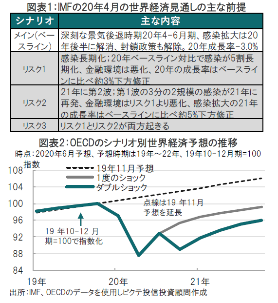 まず、4月のIMFの世界経済予想の骨格を簡単に振り返ります。IMFはメインシナリオと、3つのリスクシナリオを策定していました(図表1参照)。メインシナリオでは4-6月期に最悪期を迎え、年後半は感染拡大も収束するといった前提で、20年の世界経済成長率がマイナス3.0%と予想されています。感染長期化や感染第2波の拡大はリスクシナリオとして用意されていたという位置づけと見られます。