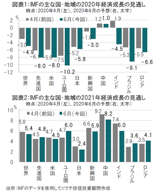 国際通貨基金(IMF)は2020年6月24日、最新の世界経済見通し(WEO)を公表しました。IMFは4月に示した成長率予想を下方修正し、20年の世界GDP(国内総生産)成長率はマイナス4.9%としました(図表1参照)。4月時点の予想はマイナス3.0%でした。また、21年は前回予想の5.8%増から5.4%増に引き下げたました(図表2参照)。